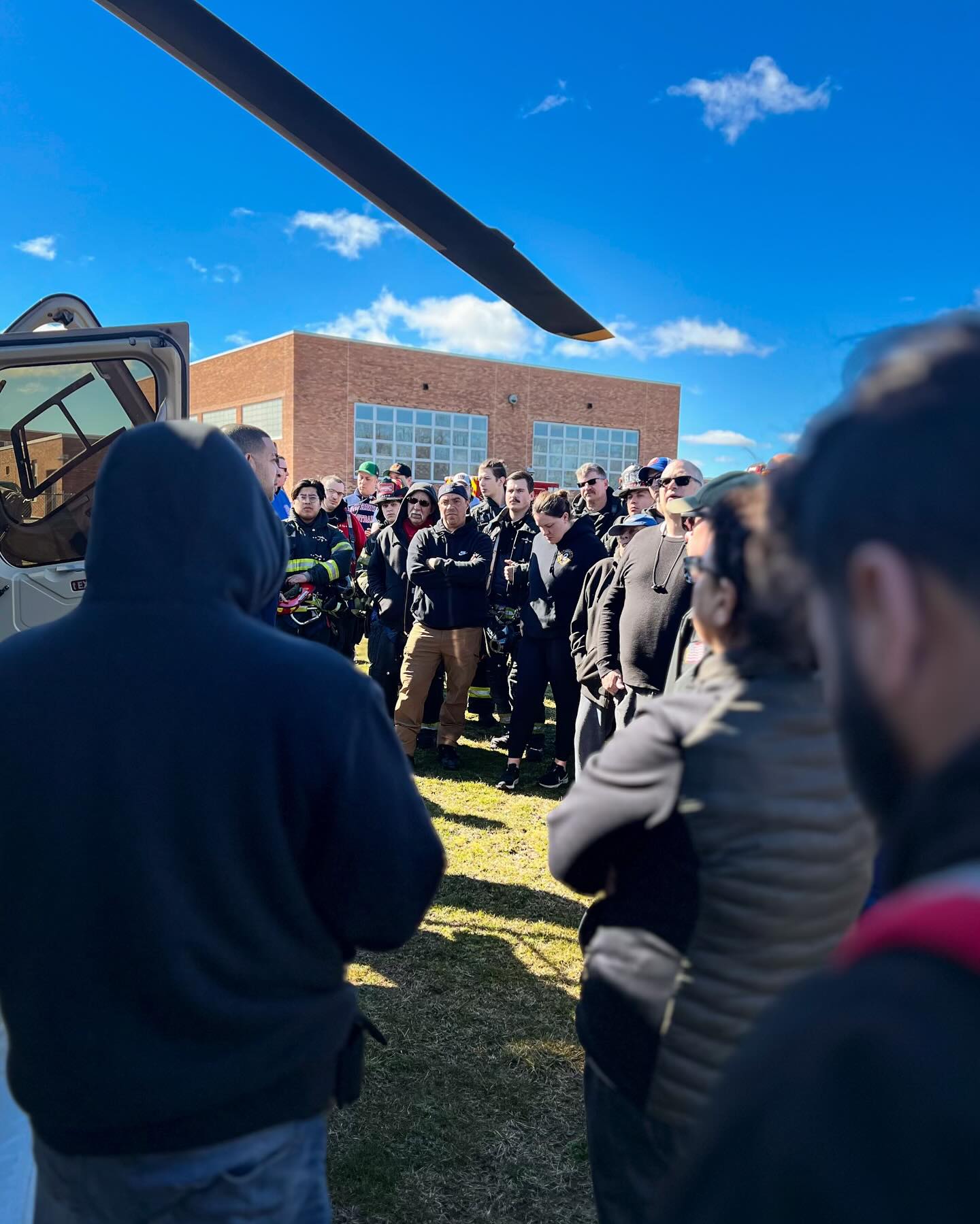 A group of firefighters and civilians gather around a Nassau Police helicopter on a grassy field. The sky is clear with a few clouds. The helicopter is blue with visible rotors. Participants wear various uniforms, and the scene suggests an event or demonstration.